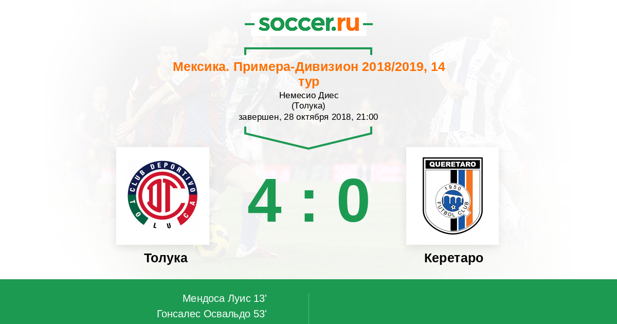 13' (1:0) Мендоса Луис (7) (Гарсия Сантьяго (3))