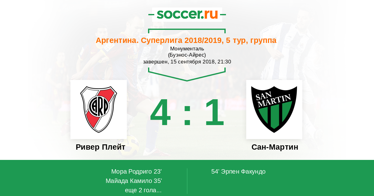 Запасные: 15 Паласиос Эксекьель (с 46'), 19 Борре Сантос (с 63'), 10 Мартинес Гонсало (с 63'), 23 Понцио Леонардо, 14 Люкс Герман, 20 Каско Милтон, 2 Майдана Хонатан