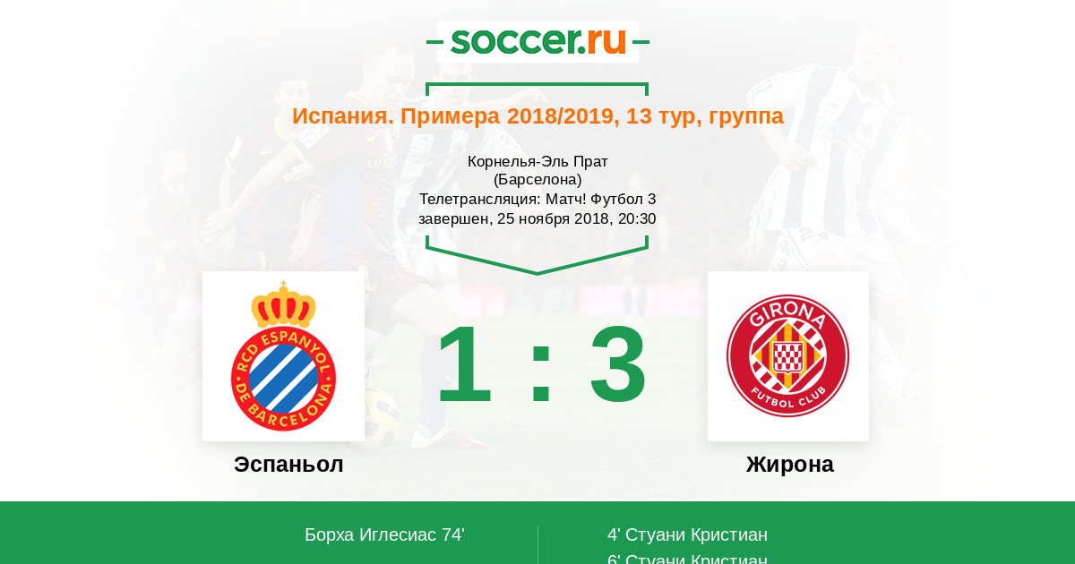 4' (0:1) Стуани Кристиан (7) (Планас Карлес (21))