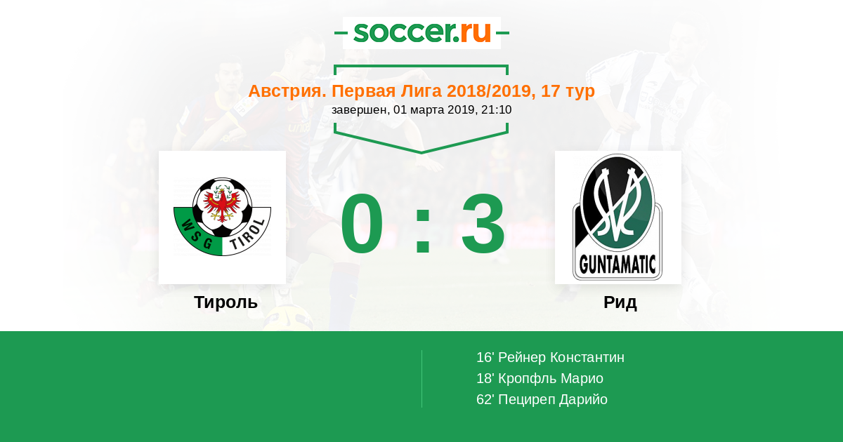 16' (0:1) Рейнер Константин (6) (Кропфль Марио (15))