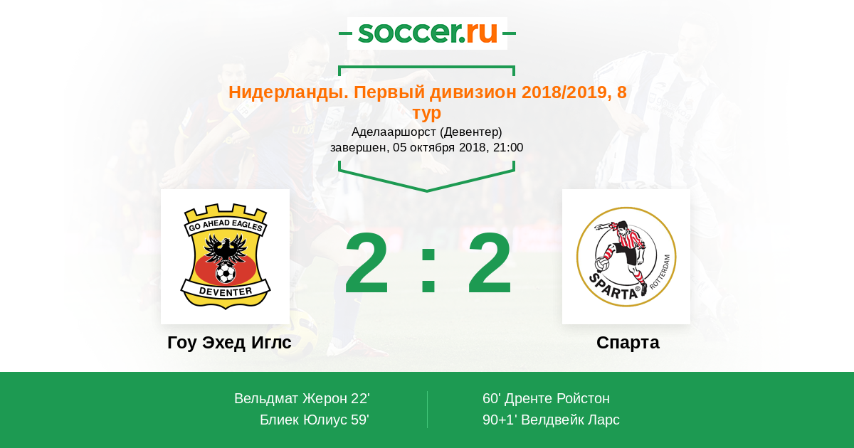 22' (1:0) Вельдмат Жерон (4) (Станс Джефф (6))