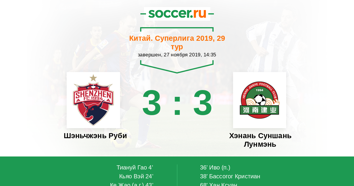 43' (3:2) Автогол Ке Жао (11)