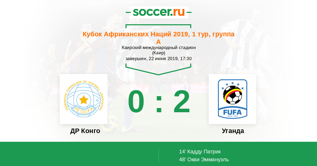 Запасные: 23 Манданда Парфэйт, 16 Мосси Энтони, 4 Унгенда Бобо, 3 Нгонда Глоди, 21 Шабани Джума, 8 Мпуту Трезор, 12 Мок Вилфред, 20 Магома Жак (с 60'), 19 Ассомбалонга Бритт (с 71'), 6 Аколо Чадрак, 9 Болинги Джонатан (с 51')
