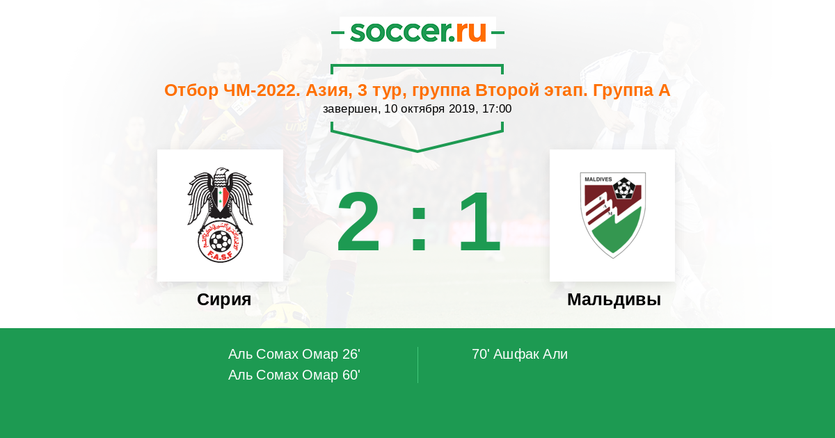 Запасные: 7 Ашфак Али (с 46'), 9 Абдулла Ассадхулла (с 69'), 14 Аяаз Ахмед (с 82'), 1 Хуссаин Шариф, 6 Самду Мохамед, 12 Назим Хассан, 15 Сааиф Мохамед, 19 Абдулла Ямин, 18 Лабаан Шариф, 13 Муджутааз Мохамед, 17 Ахмед Нахил Ибрагим, 21 Мухаммед Джайлам