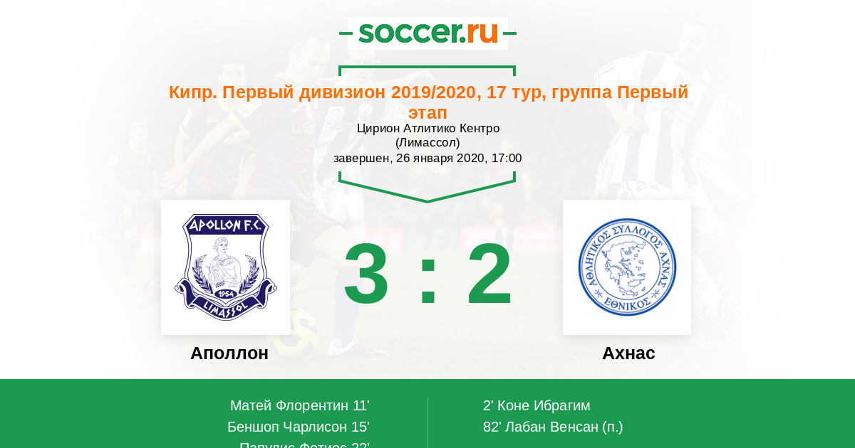 Запасные: 43 Папагеоргиу Гиоргос (с 58'), 7 Элиа Константинос (с 68'), 6 Финирис Сотирис, 13 Соуза Дейвисон, 18 Худобяк Игорь, 27 Кушиппас Гиоргос, 35 Элиа Андреас, 75 Иоанну Петрос, 86 Стратилатис Кириакос