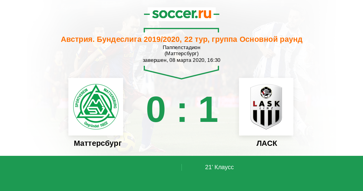 21' (0:1) Клаусс (9) (Тетте Самуэль (20))