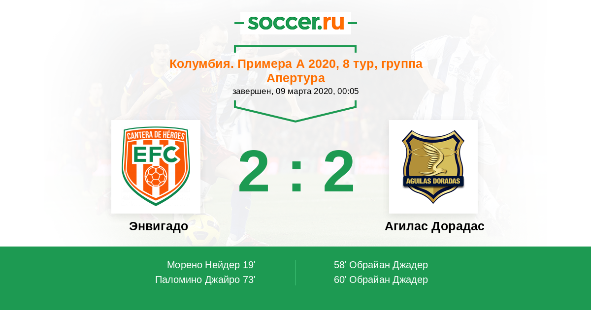 19' (1:0) Морено Нейдер (22) (Гузман Йесон (10))