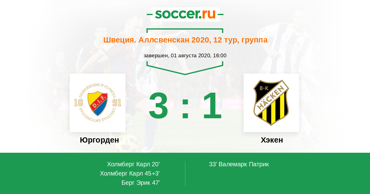 45+3' (2:1) Холмберг Карл (17) (Аугустинссон Джонатан (15))