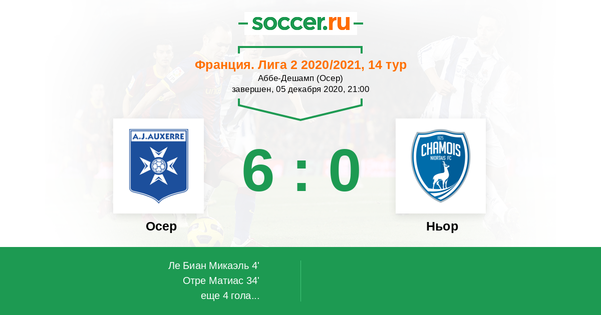 34' (2:0) Отре Матиас (29) (Ле Биан Микаэль (8))