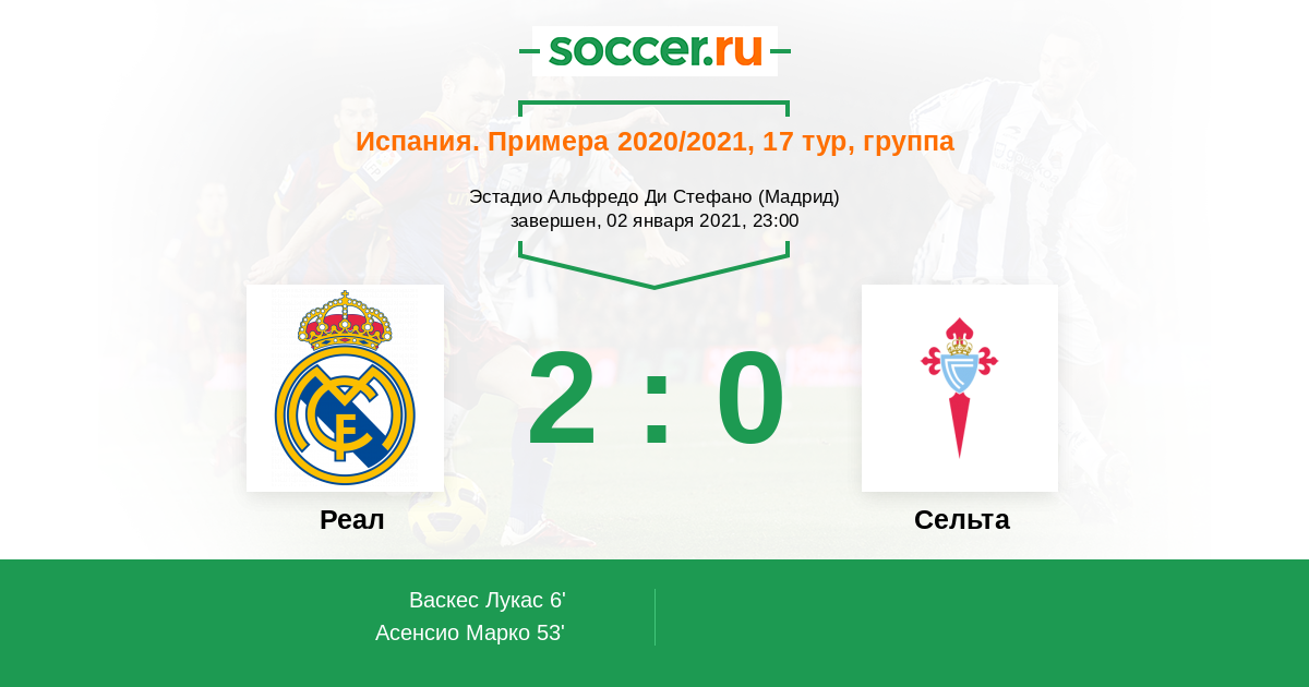 Запасные: 13 Лунин Андрей, 26 Альтубе Диего, 12 Марсело, 3 Милитао Эдер, 19 Одриосола Альваро, 21 Эдегор Мартин (с 85'), 15 Вальверде Федерико (с 85'), 22 Иско, 7 Азар Эден (с 74'), 18 Йович Лука, 24 Диас Мариано (с 90+1'), 20 Винисиус Жуниор (с 85')