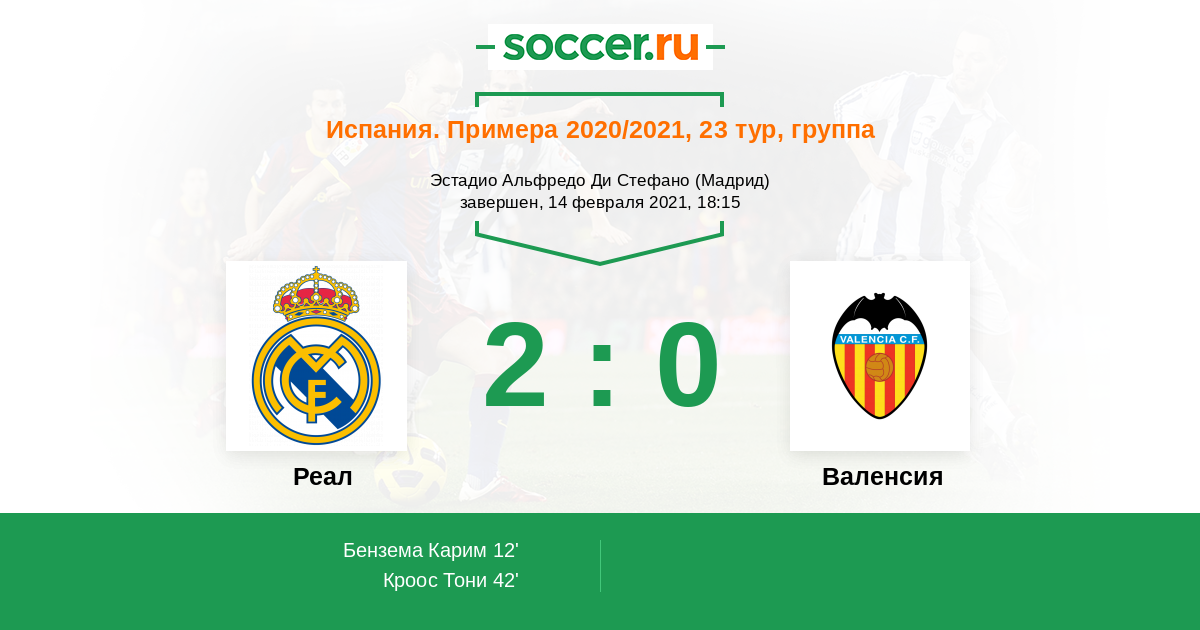 12' (1:0) Бензема Карим (9) (Кроос Тони (8))