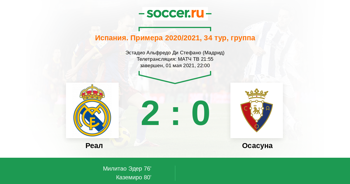 80' (2:0) Каземиро (14) (Бензема Карим (9))