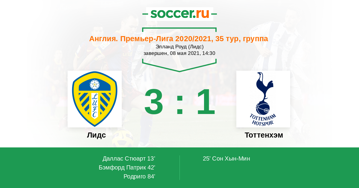– средняя результативность 10-ти последних матчей – 3 (при этом «Лидс» забивал в среднем 1,3 гола за игру, а «Тоттенхэм» – 1,7). «Лидс» лишён серьёзной турнирной мотивации, но под руководством Марсело Бьелсы не забалуешь, поэтому вряд ли хозяева слишком уж расслабятся. «Тоттенхэму», в свою очередь, нужно действовать на победу, а когда в распоряжении есть опасные форварды – рекомендуется играть в открытый футбол.
