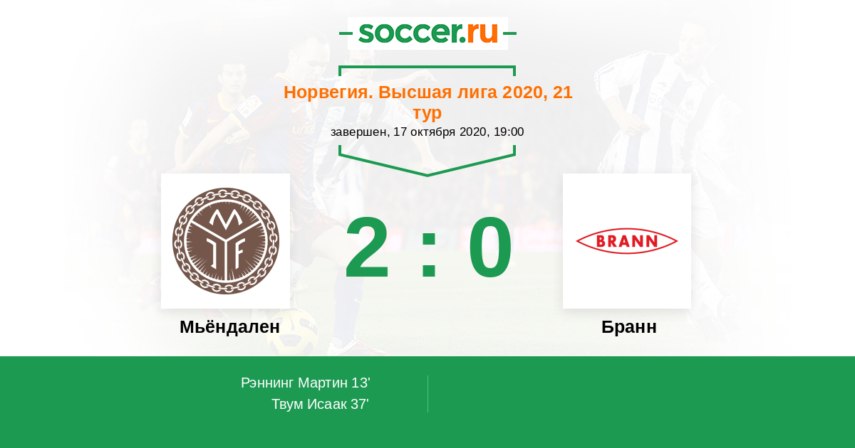13' (1:0) Рэннинг Мартин (17) (Драгснес Ветле (3))
