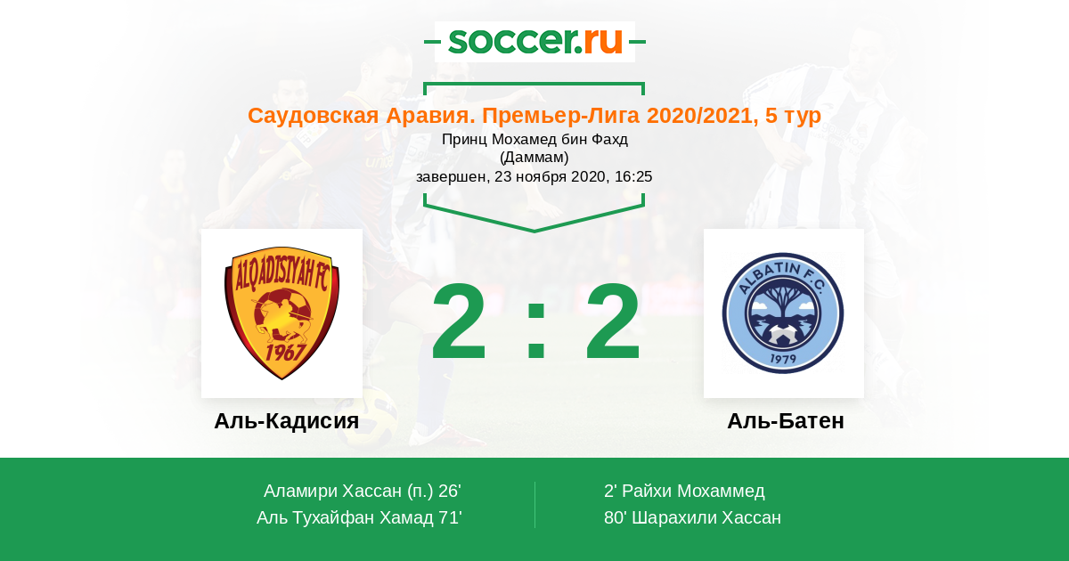 80' (2:2) Шарахили Хассан (3) (Аль-Хайри Саад (50))