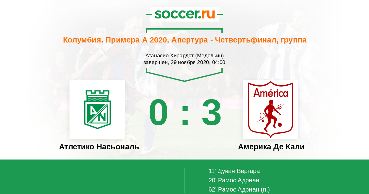 11' (0:1) Дуван Вергара (11) (Морено Сантьяго (30))