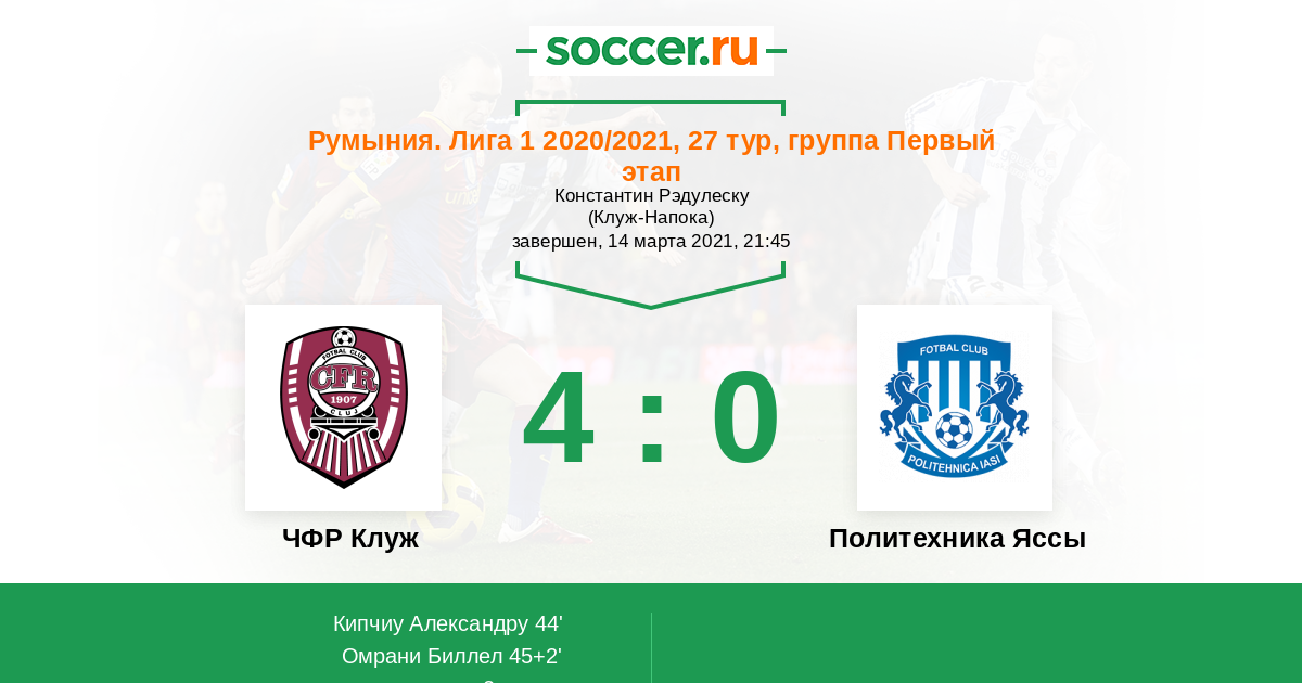 44' (1:0) Кипчиу Александру (27) (Паун Константин (7))
