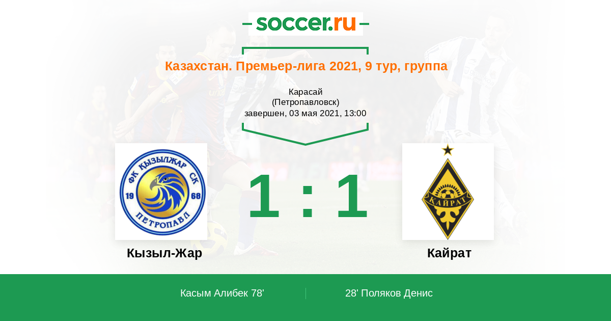 Запасные: 1 Бекбаев Алмат, 32 Петров Вадим, 40 Айтов Ильдар, 25 Есимов Руслан (с 63'), 20 Гунченко Виктор, 11 Черединов Артём, 7 Драченко Максим (с 23'), 12 Коне Мусса (с 63'), 27 Батырканов Эрнест (с 66'), 99 Скорых Максим