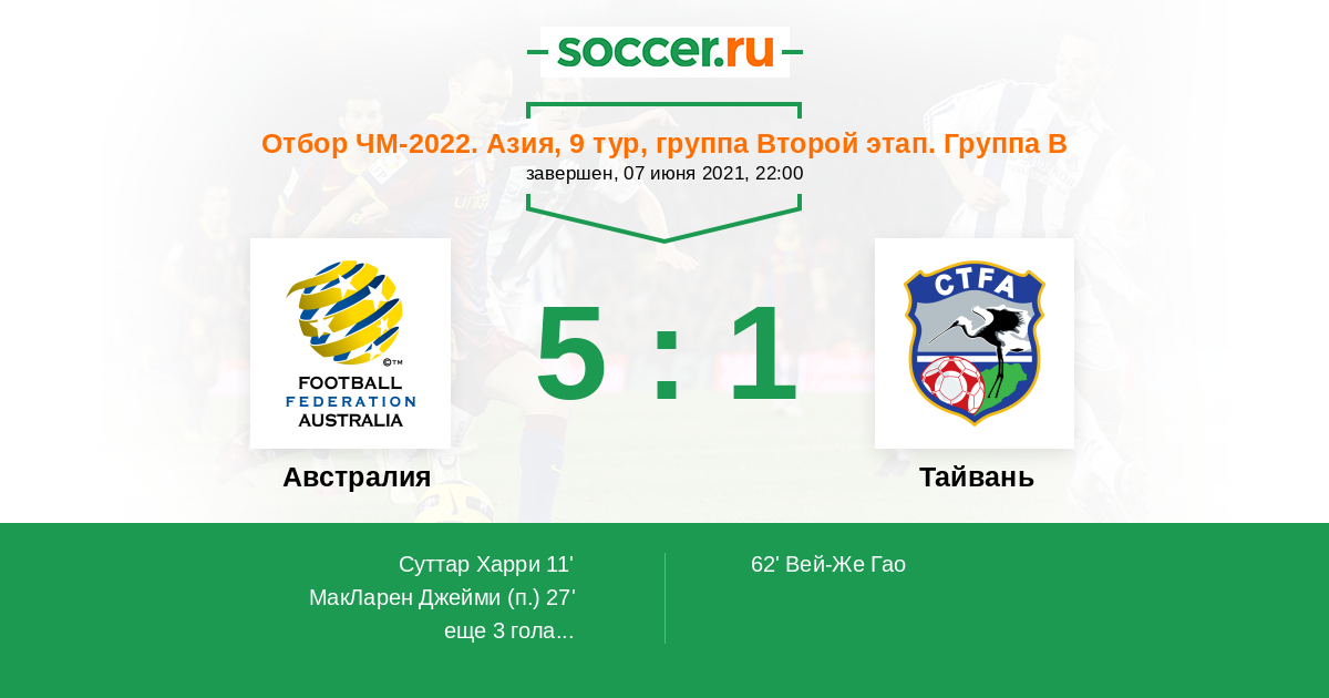 Запасные: 19 Ту Шао-Ших (с 47'), 9 Мао Ли (с 67'), 7 Минг-Вэй Лин (с 67'), 17 Хсу Хэн-Пин (с 80'), 4 Лианг Менг-Ксин (с 80'), 21 Хсиэ Пенг-Лонг, 10 И Хсу, 13 Лин Чанг-Лунь, 1 Пан Вен-Чих, 12 Тсай Менг-Ченг, 18 Туан Хсуан, 2 Ванг Руи