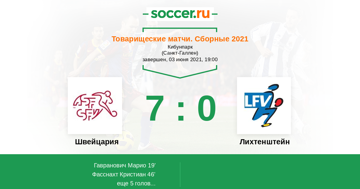 Запасные: 13 Родригес Рикардо (с 46'), 10 Джака Гранит (с 46'), 16 Фасснахт Кристиан (с 46'), 11 Варгас Рубен (с 46'), 26 Лотомба Жордан (с 67'), 20 Фернандеш Эдимилсон (с 67'), 6 Закариа Денис, 3 Видмер Силвэн, 21 Омлин Йонас, 7 Эмболо Брель, 1 Зоммер Янн, 17 Бенито Лорис