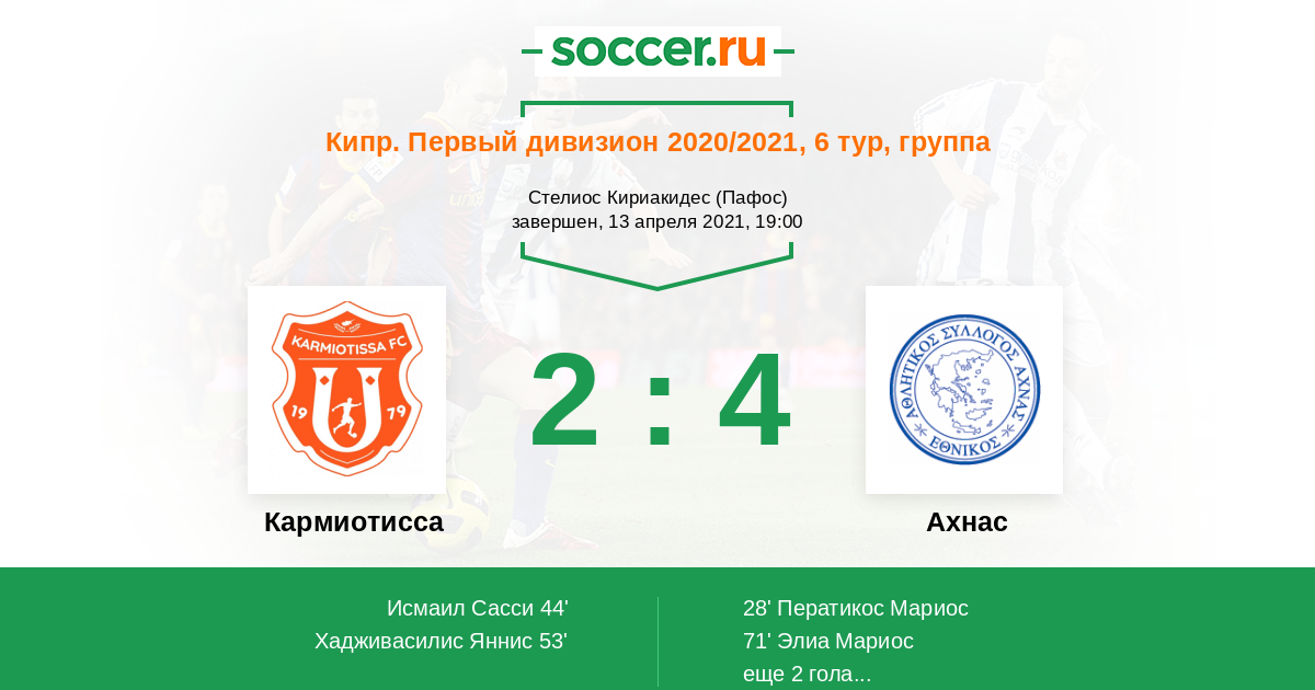 Запасные: 23 Савва Иоаннис (с 90+1'), 18 Комодикис Андреас (с 73'), 6 Пахипис Андреас (с 90'), 40 Дуарте, 9 Ромо Хосе (с 64'), 7 Сумбуну Бубакари, 15 Хрисостому Роис