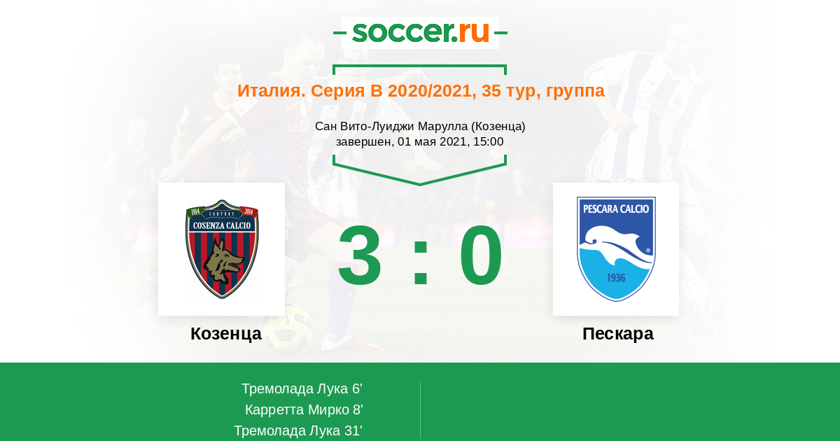8' (2:0) Карретта Мирко (10) (Тремолада Лука (21))