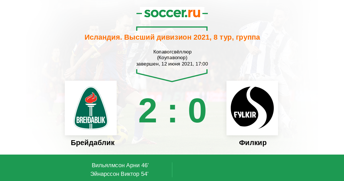54' (2:0) Эйнарссон Виктор (8) (Эйолфссон Гисли (11))