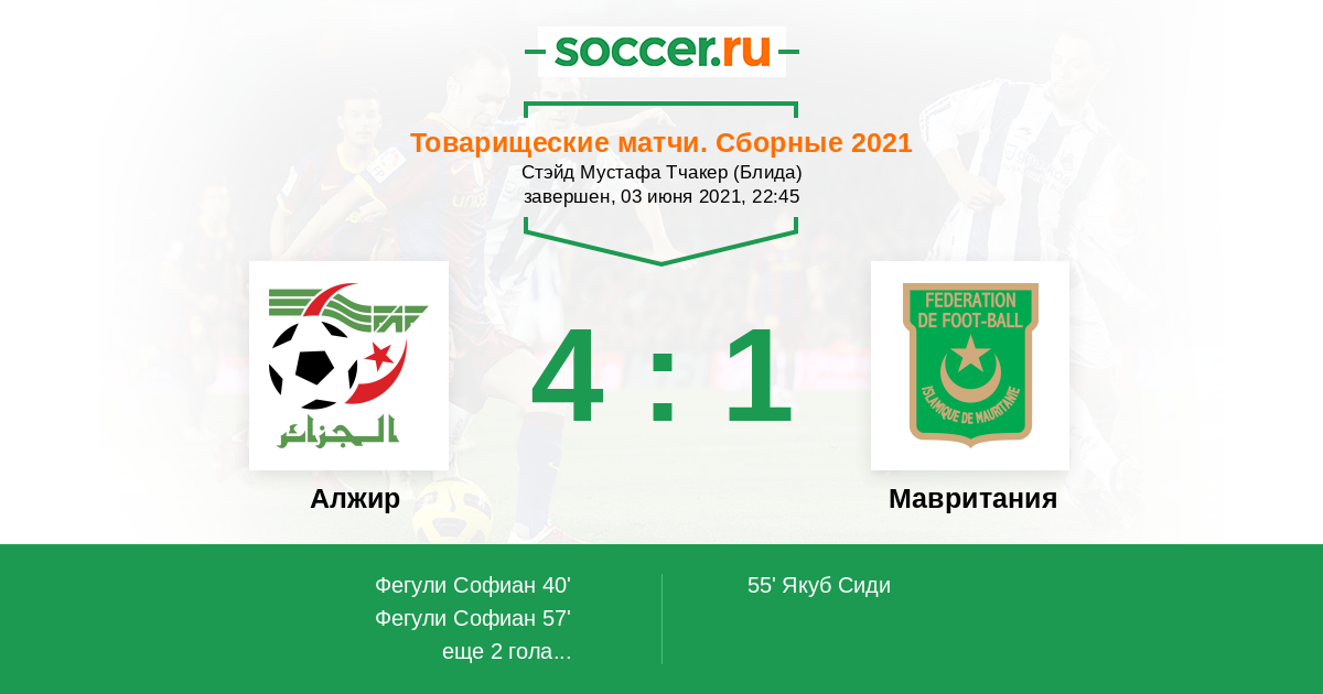57' (2:1) Фегули Софиан (10) (Слимани Ислам (13))