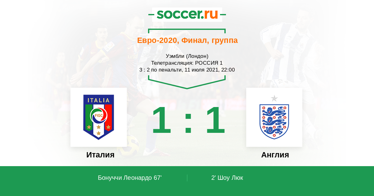 Италия же больше владела мячом, больше атаковала, играла рискованней, ярче, и не сдавалась до последнего, считаю что гол был абсолютно справедлив и логичен, при этом было очень трудно сравнять счёт, поскольку Англия играла очень качественно и организованно, в особенности в обороне, но Италия сделала что могла и создала достаточно остроты у ворот сборной Англии для того чтобы заслужить забитый гол. Ветеран и легенда Италии, а также мирового футбола, Леонардо Бонуччи, смог выжать максимум из эпизода и перевернуть ход матча.
