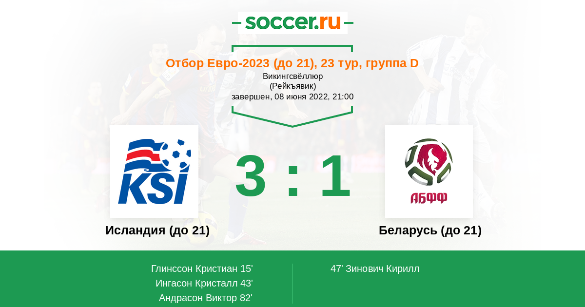 Запасные: 23 Магнуссон Сэвар (с 54'), 18 Андрасон Виктор (с 68'), 6 Торхаллссон Дагур (с 86'), 3 Робертссон Логи, 19 Томассон Логи, 21 Оскарссон Орри, 22 Август Эдвальд Глинссон, 12 Бенедиктссон Адам, 15 Омарссон Оли