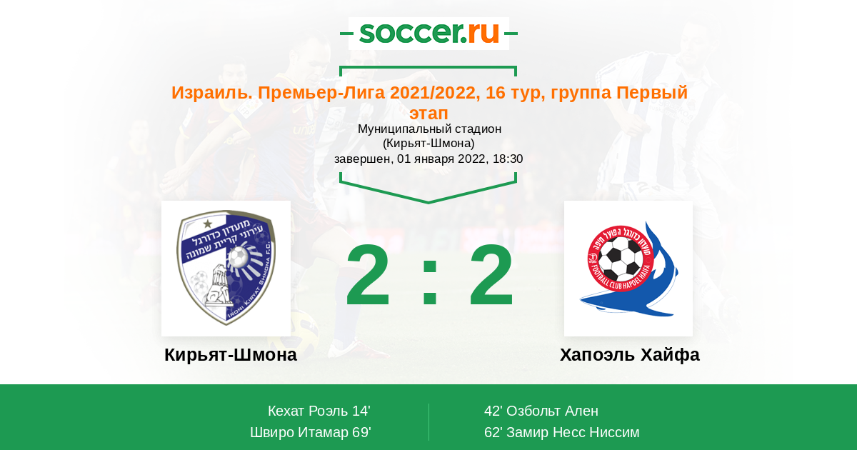 14' (1:0) Кехат Роэль (19) (Бар-Он Самуэль (10))