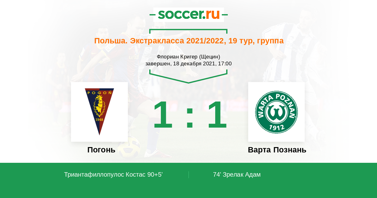 90+5' (1:1) Триантафиллопулос Костас (13) (Форналчик Мариуш (17))