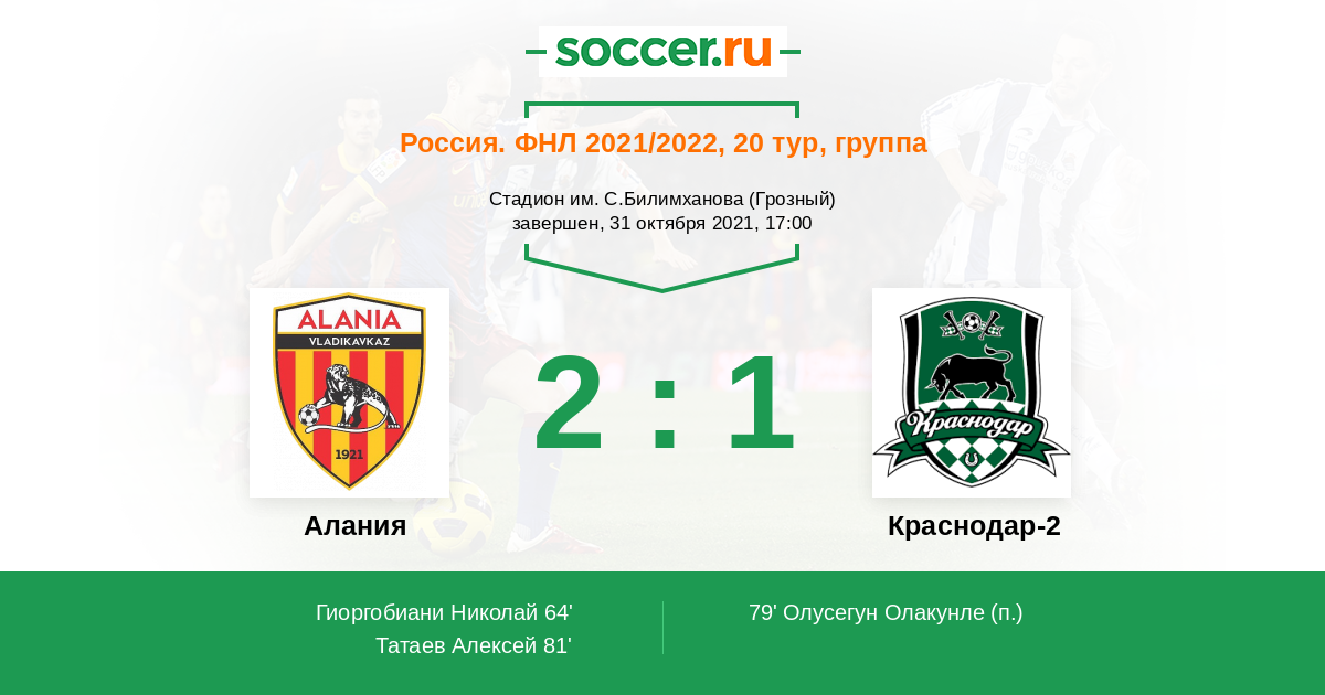 Запасные: 10 Хадарцев Батраз (с 38'), 2 Татаев Алексей (с 45+2'), 70 Эльдарушев Абу-Саид (с 45+2'), 7 Гурциев Батраз (с 63'), 8 Хугаев Алан (с 63'), 3 Шавлохов Давид, 13 Засеев Азамат, 17 Дзахов Давид, 21 Кокоев Батрадз, 23 Сосранов Рустам, 31 Натабашвили Георгий, 88 Кобесов Дмитрий