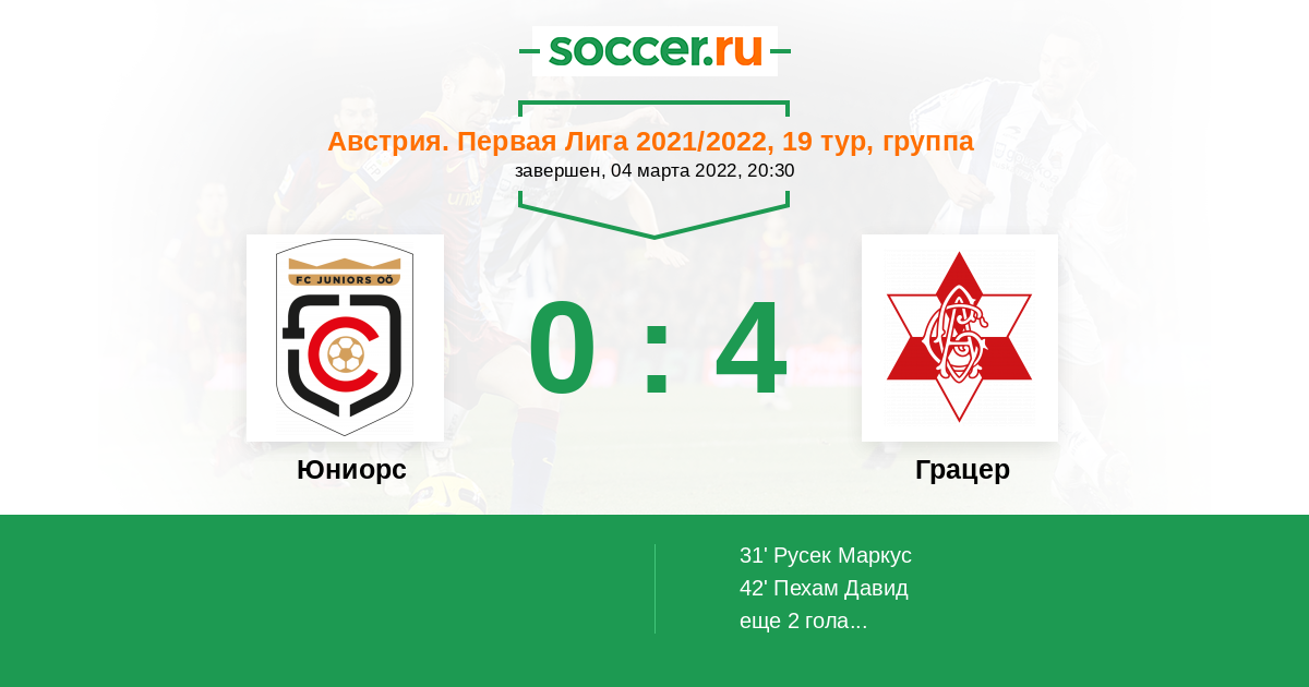 31' (0:1) Русек Маркус (6) (Хубер Михаэль (3))