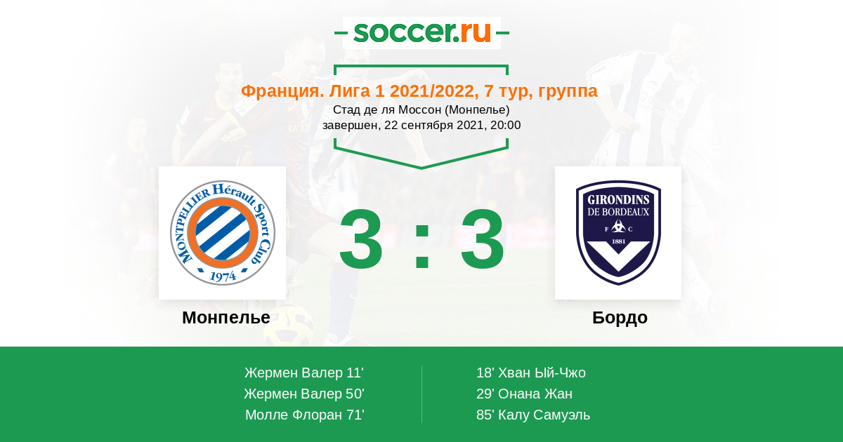 11' (1:0) Жермен Валер (9) (Мавидиди Стеф (10))