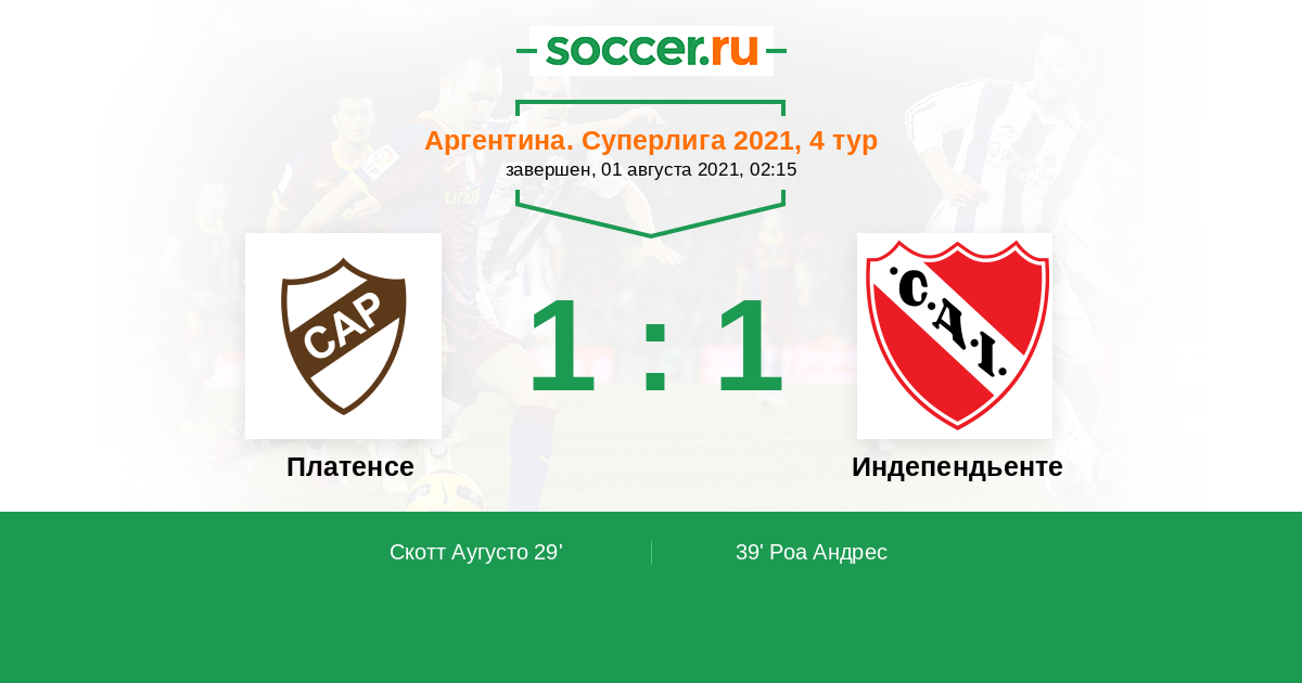 39' (1:1) Роа Андрес (7) (Гонсалес Лукас (14))