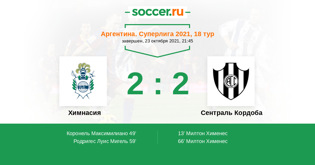 66' (2:2) Милтон Хименес (45) (Брочеро Лукас (21))