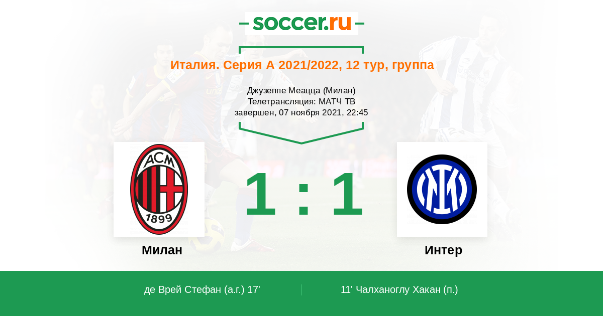 Настоящее миланское дерби , которое в итоги так и не выявило победителя . Боевой матч который держал в напряжение болельщиков обих команд , когда по очерёдно мяч держался и игра шла от ворот до ворот . И первые двадцать минут которые решили исход всего противостояния тому яркое подтверждение , когда уже на одинадцатой минуте игры был назначен пенальти в ворота Милана . К точке подошёл Чалханоглу и точным ударом вывел Интер вперёд. Не прошло и шести минут, как атака Милана завершилась автоголом , Стефан де Врей отправил мяч в собственные ворота. Накал борьбы не ослабевал ни на минуту. Проходит десять минут и за игру рукой в своей штрафной площади Милана и опять главный судья матча ставит на точку . И тут к мячу подходит Лаутаро Мартинес , но его удар парирует вратарь Милана Тэтэрушану . Интер так и не смог больше реализовать свои моменты, в принципе как и игроки Милана . Но игра получилась настоящим дерби , которое так и не выявила победителя . Ничейный исход, думаю справедлив , ведь и каждая из команд могла вырвать победу, но это футбол, тем он и хорош !!! Всем Добра !!!