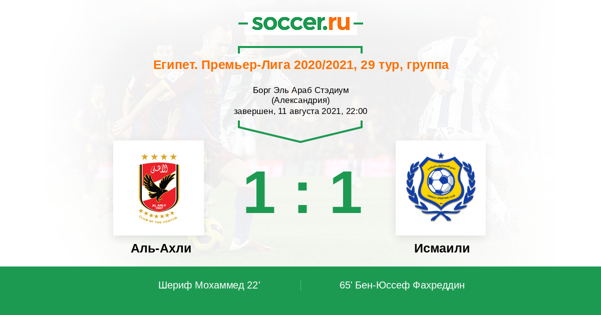 22' (1:0) Шериф Мохаммед (10) (Магди Кафша Мохаммед (19))