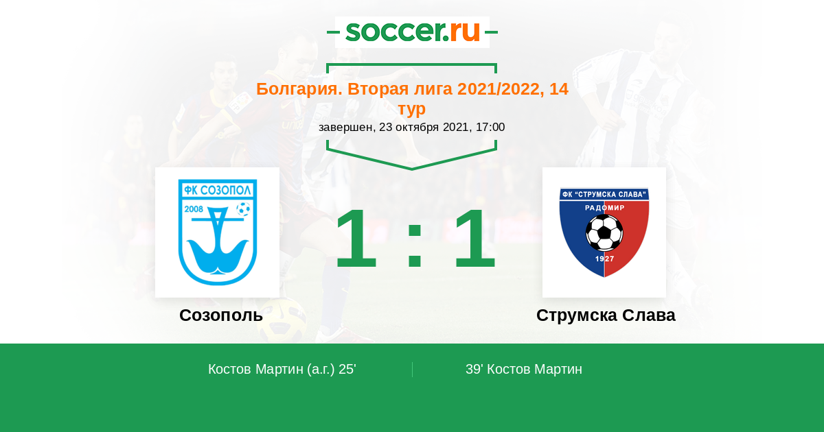 25' (1:0) Автогол Костов Мартин