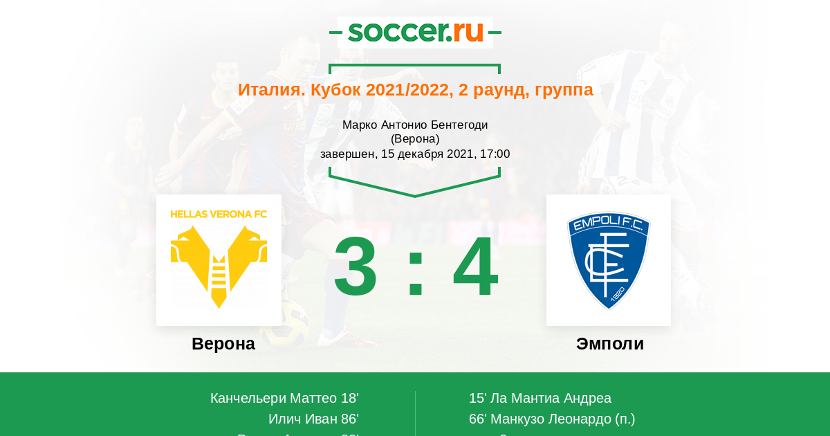 18' (1:1) Канчельери Маттео (18) (Бесса Даниэль (24))