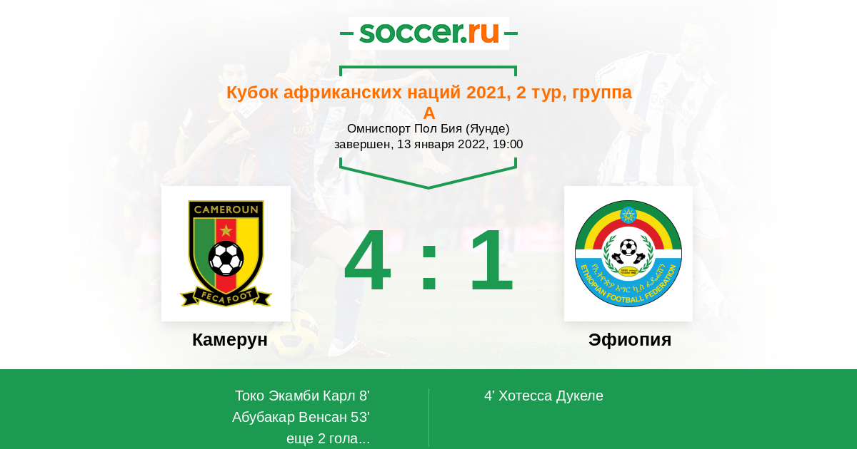 Запасные: 23 Меджо Омоссола, 16 Эпасси Дэвис, 17 Мбайзо Оливье, 22 Онгене Жером, 6 Ойонго Амбруаз (с 79'), 27 Леа Силики Джеймс (с 56'), 15 Кунде Пьер, 14 Гвет Самуэль, 11 Бассогог Кристиан, 20 Ганаго Игнатиус (с 70'), 9 Баокен Стефан (с 79'), 7 Н'Жи Клинтон (с 69')