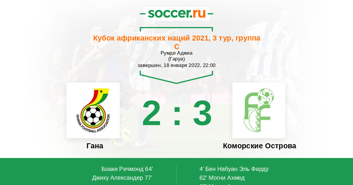 При счете 2:2 сначала Гана старалась забить с углового прямым ударом, но вратарь коморской сборной в последний момент всё-таки спас свою команду. Затем уже Коморы два раза подряд с углового пытались осуществить "сухой лист", но этого и им не удалось.