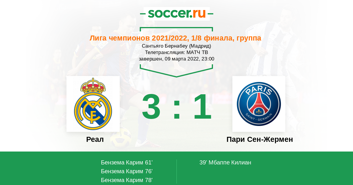 61' (1:1) Бензема Карим (9) (Винисиус Жуниор (20))