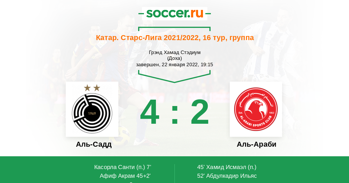54' (3:2) Афиф Акрам (15) (Ассадалла Али (8))