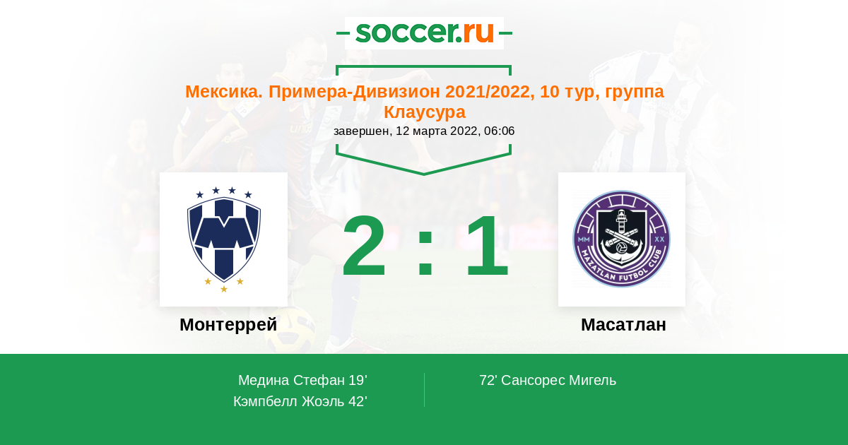 19' (1:0) Медина Стефан (33) (Гонсалес Артуро (21))