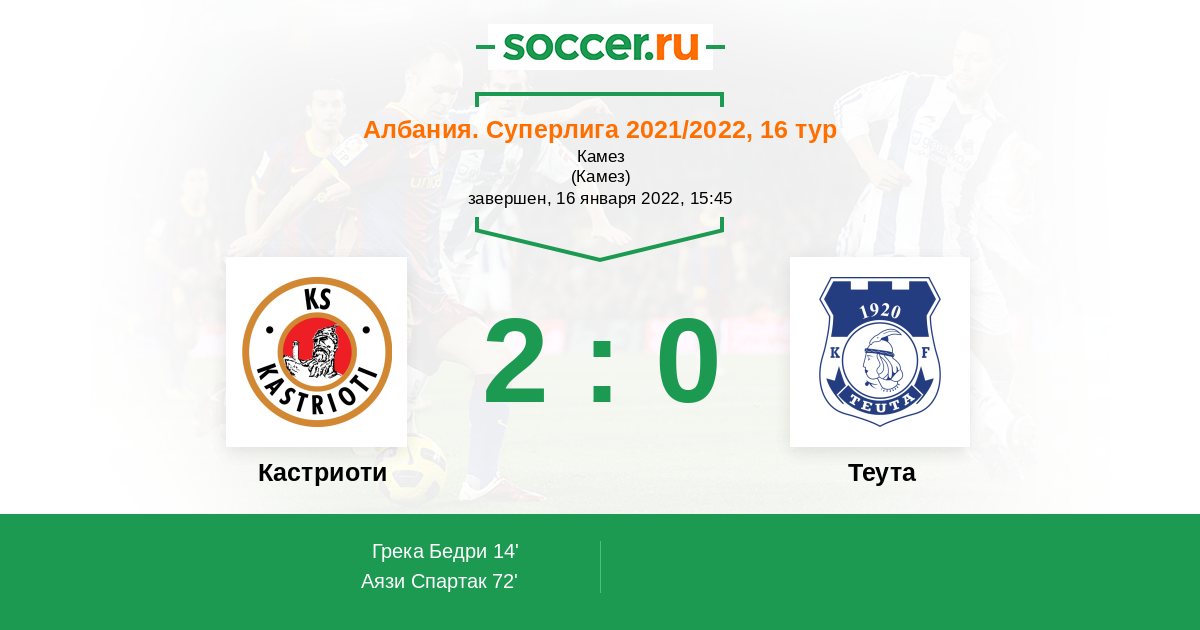 Запасные: Дида Беким (с 46'), Продани Индрит (с 63'), Аязи Спартак (с 71'), Онануга Олавале (с 90+1'), Шала Арлис, Вата Элтон