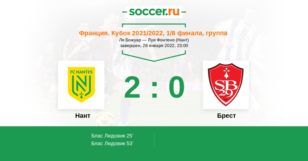 25' (1:0) Блас Людовик (10) (Паллуа Николя (4))