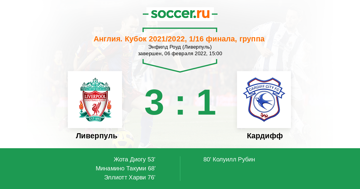 Легкой прогулки на Энфилде может и не быть. Отсутствие Салаха и Мане, которые будут в финале кубка Африки может притормозить ударную силу нападения за счёт малой сыгранности в официальных играх, если только на тренировках. Также в одном источнике было указано что у валийского клуба боевой настрой, а также приедут поддержать своих около 7 тысяч болельщиков (!!!), и это во времена ковида. Думаю Кардифф даст бой..