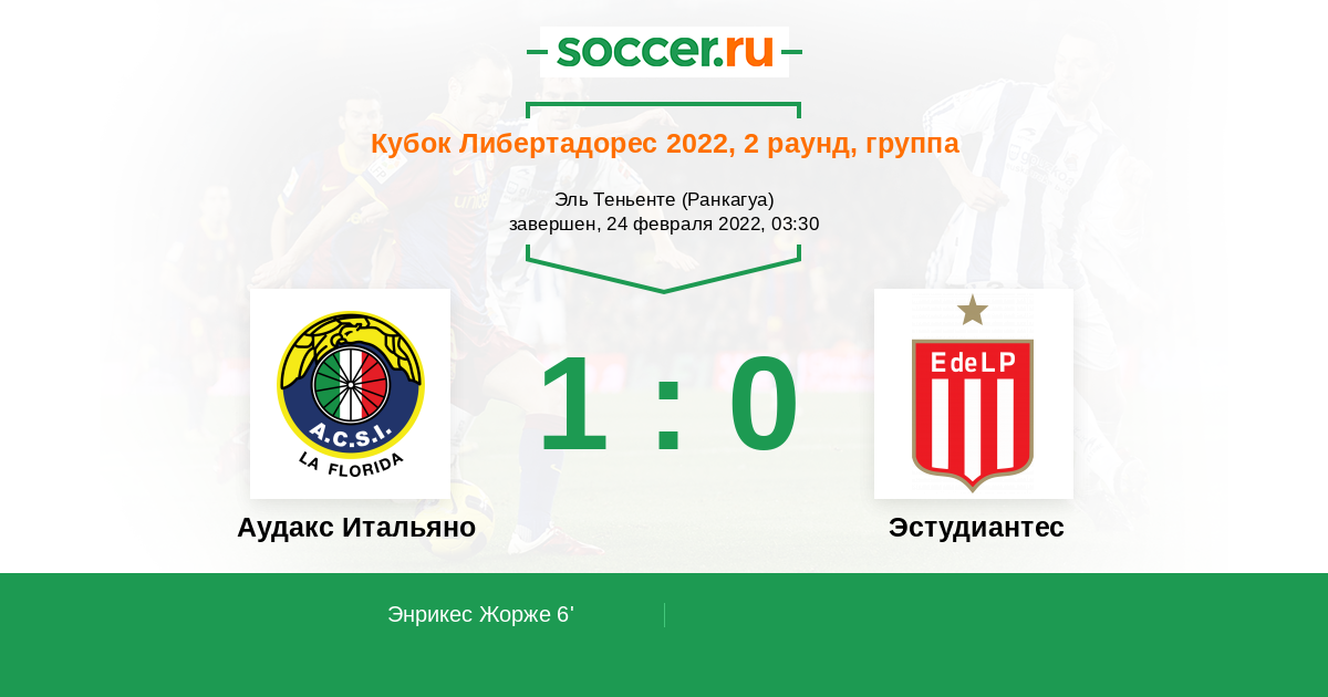 6' (1:0) Энрикес Жорже (10) (Боссо Освальдо (4))